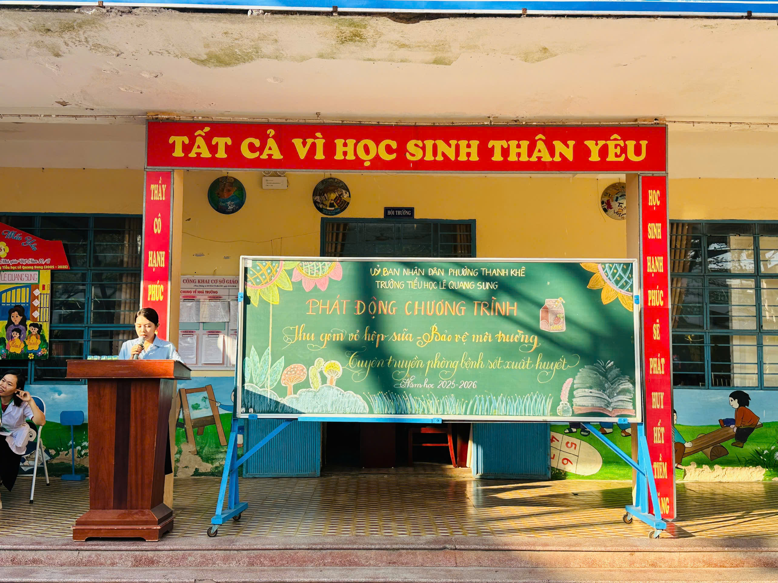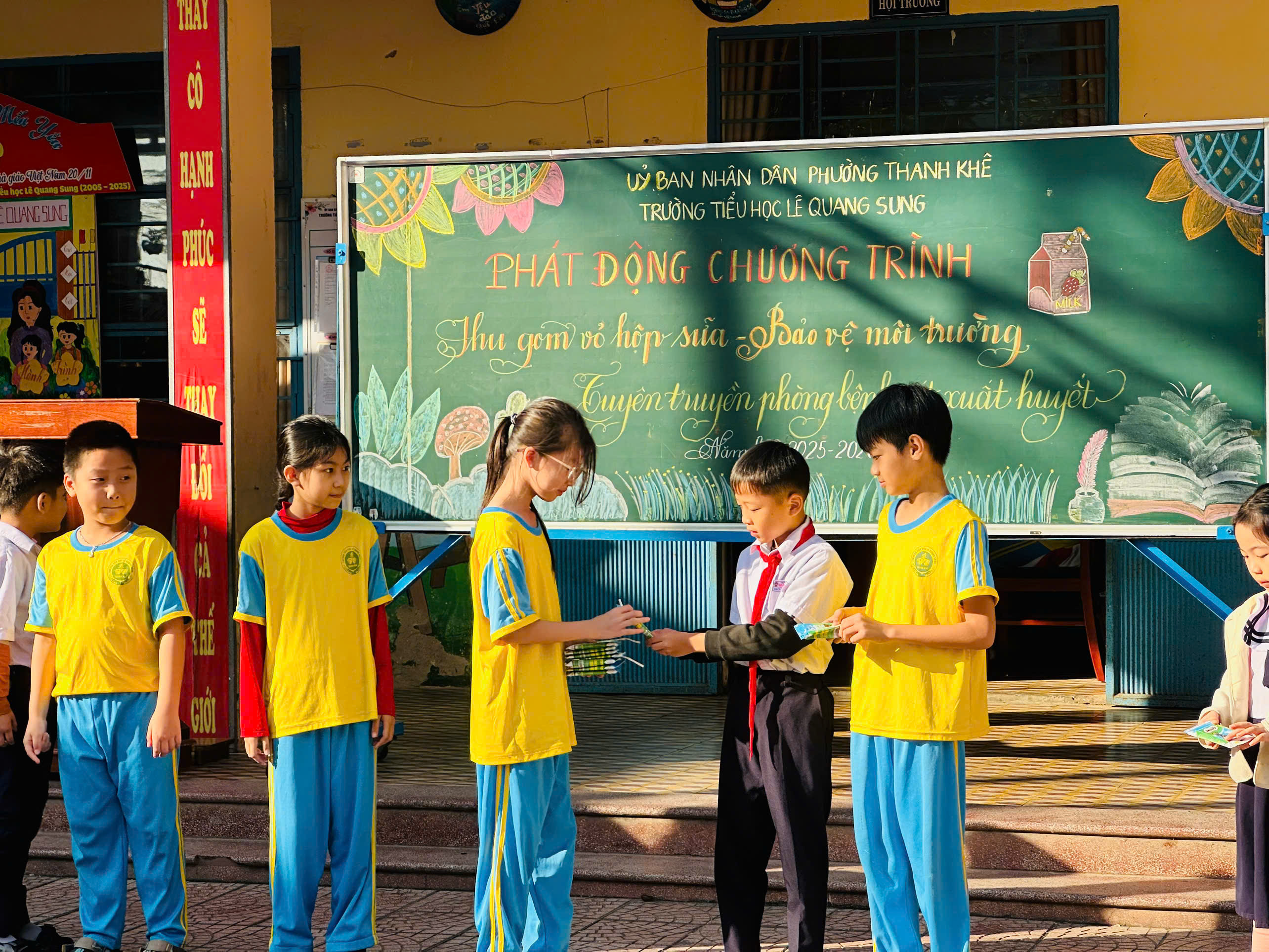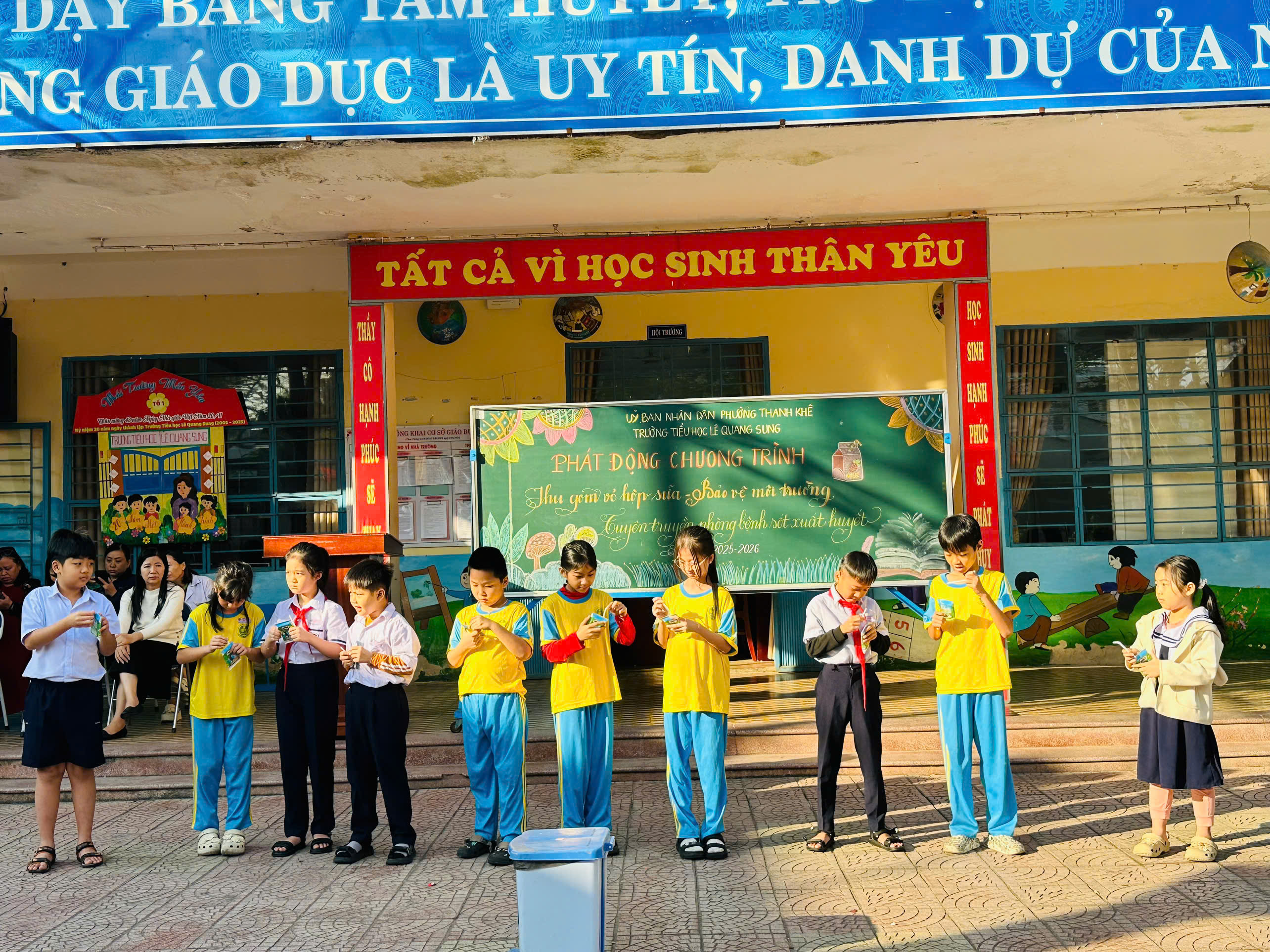 - Được phát động vào sáng 19/1/2026 với sự tham gia của 53 cán bộ giáo viên, nhân viên và gần 900 học sinh. Mở đầu chương trình, cô Trần Thị Thanh Lam (giáo viên TPT) đã nêu ý nghĩa của việc thu gom vỏ hộp sữa đã quan sử dụng. Sau đó, đại diện các học sinh các khối lên thực hiện thao tác thu gom, xếp hộp sữa nhỏ gọn. Đây là hoạt động có ý nghĩa sâu sắc, giúp các em học sinh thu gom vỏ hộp sữa đã qua sử dụng phục vụ công tác tái chế.